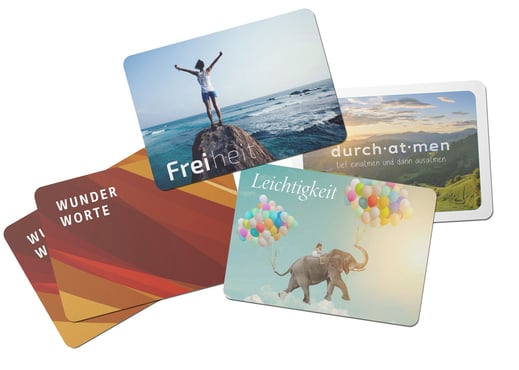 Wenn Sie unsere Arbeit mit einer Spende ab 10 € unterstützen, senden wir Ihnen gern ein Set der „Wunderworte“ als Dankeschön zu: 52 liebevoll gestaltete Karten mit positiven Impulsen, begleitet von einem kleinen Booklet mit Anwendungsideen – für Beratung, Gruppenarbeit, therapeutische Settings oder einfach zur persönlichen Inspiration.
